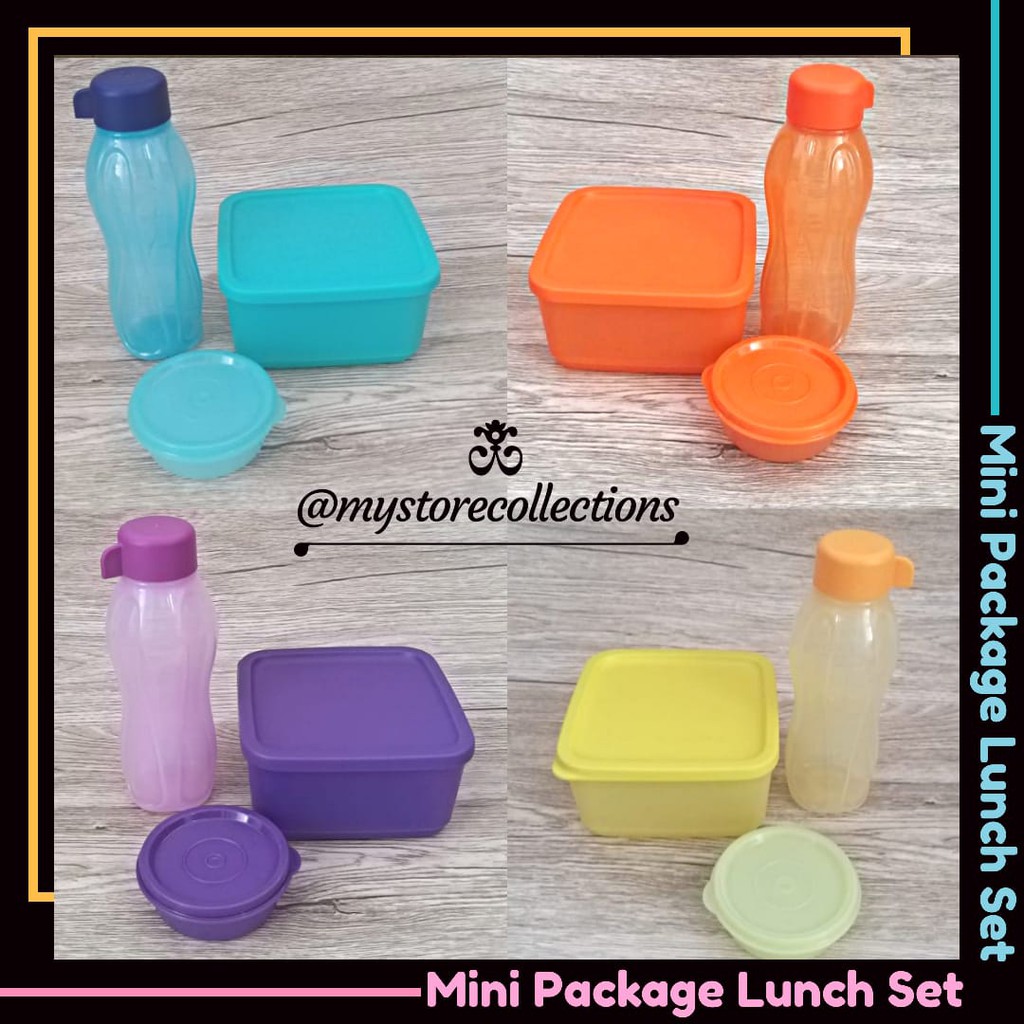 Paket Bekal ( Mini Lunch Set Package) Eco Bottle 310ml Ukuran : @310ml / d : 6 cm / t : 17.5 cmSaat piknik dan berolahraga, kebutuhan cairan tubuh meningkat. Untuk memenuhinya, Anda harus minum sebelum, saat, dan setelah berolahraga dan bepergian. Pilih wadah minuman yang handy dan praktis untuk dibawa seperti Eco Bottle 310ml ! Selain ergonomis, produk ini juga memiliki pilihan warna yang segar dan ceria.Small Summer Fresh (1 Pcs)Ukuran : 650ml / 12.6 x12.6 x 6.7 cmPiknik atau rekreasi ke luar rumah menjadi alternatif aktivitas akhir pekan keluarga yang menyenangkan. Tambah ceria jika ditemani dengan koleksi Small Summer Fresh (1) dari Tupperware ini. Kombinasi warna-warni cerahnya menambah kemeriahan menyantap kudapan di bawah sinar hangat matahari bersama teman atau keluarga.Small Round Container (1 Pcs)Ukuran : 80 ml // d 8,2 cm // t 3 cm Kegunaan : Wadah mini bisa digunakan untuk tempat sambal, saos, obat kapsul, permen ataupun peniti.Kedap dan ketat udara. NB : MOHON TANYAKAN KETERSEDIAAN BARANG TERLEBIH DAHU
