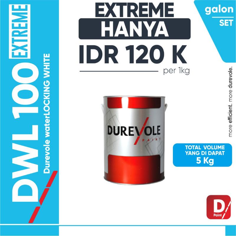 DUREVOLE WATERLOCKING SYSTEM ADALAH TEKNOLOGI TERBARU DARI ITALY UNTUK SYSTEM WATERPROOFING. PRODUK INI DIDESAIN KHUSUS DENGAN KEMAMPUAN HYDROSTATIC NEGATIVE PRESSURE SEHINGGA DINDING TIDAK AKAN MENGALAMI GEMBUNG/ BLISTER DAN MEMILIKI NANO PARTICLE SIZE SEHINGGA MAMPU MENUTUP PORI-PORI PADA SEMEN DENGAN SANGAT BAIK.DWL 100 EXTREME (DUREVOLE WATERLOCKING SYSTEMNOTE : KIRIMAN MINIMAL 1 DOS BISA HUBUNGI KAMI FAKTANYA :SAMPAI SEKARANG BELUM ADA CAT WATERPROOF YANG MAMPU DIAPLIKASI PADA TEMBOK BAGIAN DALAM YANG REMBES/ LEMBAB DAN TIDAK MENGALAMI KEMBUNG/ BLISTER. HANYA DWL 100 (DUREVOLE WATERLOCKING SYSTEM) YANG TERBUKTI MAMPU DAN AMAN.6 KEHEBATAN SUPER DARI DUREVOLE WATERLOCKING SYSTEM :1. BISA DIAPLIKASIKAN PADA TEMBOK BAGIAN DALAM DAN LUAR (JADI HEMAT BAHAN BOSS)2. MAMPU MENGATASI TEMBOK DALAM YANG LEMBAB/ REMBES DENGAN AMAN (DIJAMIN TIDAK BAKAL KEMBUNG)3 TIDAK BERBAU/ NON TOXIC4. MEMILIKI KETAHANAN YANG LUAR BIASA TERHADAP SINAR MATAHARI APABILA DI APLIKASIKAN PADA TEMBOK LUAR5. DAPAT BERTAHAN TERHADAP HYDROSTATIC NEGATIVE PRESSURE >50 PSI ATAU SETARA DENGAN TEKANAN AIR 12 - 15 METER DI BAWAH TANAH (LANTAI BASEMENT) JOSS BANGET6. MEMENUHI STANDARD ASTM D 7088-04 (STANDARD PRACTICE FOR HYDROSTATIC PRESSURE FOR COATING APPLIED TO MASONRY)*MIXING RATIO100 : 10DWL 100 EXTREME (CAT DUREVOLE WATERLOCK) : AIR BERSIH* LANGSUNG AJA BOSS PAKAI DUREVOLE WATERLOCKING DIJAMIN BERES MASALAH TEMBOK LEMBAB/ REMBESDI TUNGGU BOSSKU ORDER