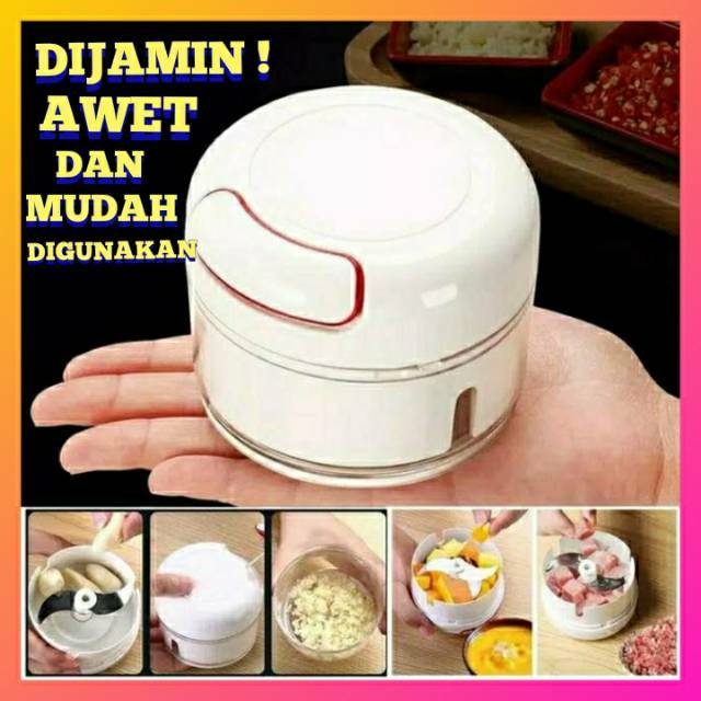 Blender tangan yang praktis, bisa dimanfaatkan untuk mencincang aneka bawang, sayur, maupun daging.Cara menggunakannya cukup dengan menarik tuas yang ada di bagian atas tutup (lihat gambar). Dengan pisau berbahan stainless, pisau ini tajam dan mudah dibersihkan.Mudah dan praktisTanpa menggunakan ListrikMudah Di bersihkan.Fitur:1. Tubuh cup food grade kuat dan lebih tahan jatuh.2. Perkuat bilah sehingga tidak takut memecahkan es.3. Kolom pisau magnetik, adsorpsi lebih aman.4. Desain gesper, aman dan tidak tergelincir.5. Logam menarik tali mulut, tali pelindung tahan lama.6. Operasi sederhana, cukup tarik.7. Desain cantik dan imut.Spesifikasi:Bahan: ABS + PC + PP + stainless steelKapasitas: 170MLWarna : Putih sesuai ga