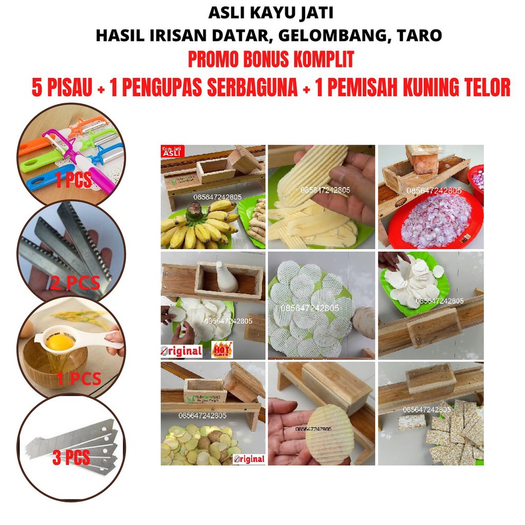 BAHAN KAYU JATI KERAS SUPER AWETTOTAL 7 ITEM BONUS5 PISAU (3 PISAU DATAR + 2 GELOMBANG)1 PENGUPAS BUAH/SAYUR1 PEMISAH KUNING TELURHARGA PROMOREADY STOK dan SIAP KIRIMBISA BAYAR DI TEMPAT (COD) Irisan BISA TIPIS, GELOMBANG dan TARO Ketebalan irisan BISA DIATURUntuk mengiris berbagai macam bahan✅ Kentang✅ Singkong✅ Pisang✅ Bawang✅ Tempe✅ Cabai✅ Buah✅ Sukun✅ Kacang✅ Ubi.PACKING KARDUS TEBAL, AMAN DAN RAPIukuran alatpanjang 37 cmlebar 9 cm#pengirisbawang#pengiriskentang #pengirispisang #pengirsserbaguna #alatirisbawang #alatiriskeripik #alatirispisan #alatirisisansingkong #alatiriskentang #pemotongkeripiktempe #pemotongbawang #pemotongkentang #pemotongserbaguna #pemotongsayur #pemotong#peng