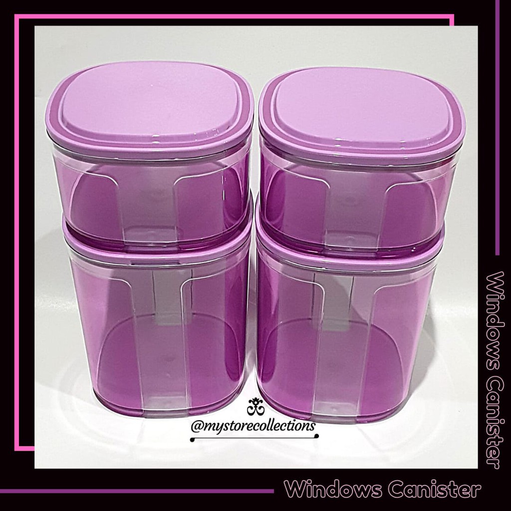 Windows Canister Purple 700ml & 1.5L Ukuran:@ 700 ml / 13 x 13 x 8 cm@ 1.5L / 12.4 x 12.4 x 16 cmKue kering memang paling pas untuk camilan sendiri atau untuk menyuguhkan tamu yang berkunjung. Nah, agar sajian kue lebih menarik, Tupperware menghadirkan Window Canister 700ml (1) yang cantik dan mewah sebening kristal. Wadah penyimpanan ini tidak hanya sekedar menyimpan makanan, melainkan berfungsi untuk menjaga kualitas kue yang ada di dalamnya. Tak hanya itu, Window Canister juga dilengkapi dengan beragam fitur unggulan, di antaranya :1.Bahan PC yang mewah, kuat dan anti stain (noda).2.Pada sudut sealnya/ tutup terdapat silicone sehingga menutup lebih rapat. 3.Base transparan, sehingga mudah untuk melihat isinya.4.Seal ketat udara menjaga kue tetap renyah.5.Dapat saling ditumpuk saat disajikan. Window Canister sangat tepat digunakan untuk menyimpan kue dengan ukuran kecil, aneka kacang, kismis, dan dipadankan dengan aneka Canister Collection dengan warna senada.NB: MOHON TANYAKAN KETERSEDIAAN BARANG TERLEBIH DAHU