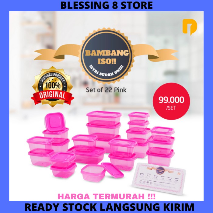Satu lagi storage multifungsi buat Anda yang sedang cari wadah atau tempat penyimpanan.Paket lengkap banget deh, sudah komplit, multifungsi, berkualitas. Harganya sangat2 terjangkau!!Mau simpan bahan makanan di kulkas? Mau simpan makanan kering di lemari dapur Anda? Mau simpan aksesoris atau alat tulis?Semua bisa lohh!!Set Bambang hadir dengan warna baru yang lebih Fresh!!Wadah multifungsi yang bisa digunakan untuk menyimpan snack, bahan masakan, sayuran/buah, agar terjada kualitasnya. Bahkan bisa untuk menyimpan perlengkapan lain seperti alat tulis dan aksesoris supaya lebih rapih.1 set Bambang ISO dan S.H isi 22 pcs:2 pcs kapasitas 1.400 ml2 pcs kapasitas 1.000 ml3 pcs kapasitas 850 ml3 pcs kapasitas 700 ml5 pcs kapasitas 450 ml7 pcs kapasitas 270 mlKeunggulan produk :-Wadah multifungsiBisa untuk menyimpan berbagai jenis bahan masakan, snack, sayuran/buah, hingga accesories.-Isi komplitGa perlu khawatir storagenya kurang karena 1 set Bambang isinya Komplit, ada 22 pcs wadah dengan berbeda ukuran.-Material PP5, BPA Free, dan food gradeTidak perlu khawatir, dengan material yang berkualitas Bambang aman untuk segala jenis makanan.-Freezer safeAman dimasukkan ke dalam freezer. Mau mendinginkan makanan? langsung masukkan bambang ke dalem freezer aja, mudah banget!-Microwave safeAman dimasukkan ke dalam microwave. Mau menghangatkan makanan? Langsung masukkan Bambang aja!-StackableMudah ditumpuk saat tidak digunakan, hemat ruang penyimpanan.-Warna baru yang super fresh, eye catchy, dan manis banget!Bikin tampilan dapur makin cantik & se