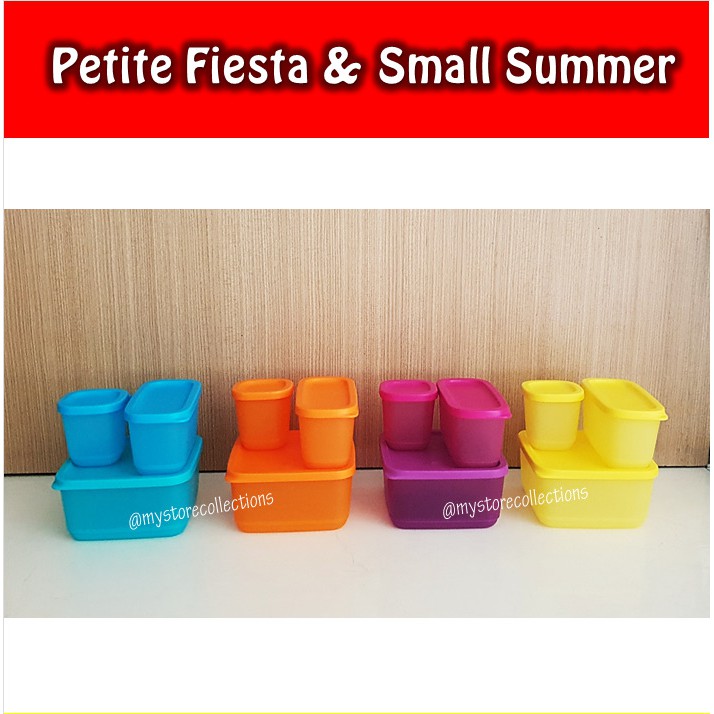 Petite Fiesta & Small Summer (3 Pcs) bekal TupwrUkuran:Terdiri dari:a. Mini Rectangular Low (1)@850 ml / 18.5 x 14 x 6.2 cmb. Mini Rectangular High (1)@2 L / 18.5 x 14 x 11.7 cmc. Smll Summer (1)@650ml / 12.6 x12.6 x 6.7 cmPiknik atau rekreasi ke luar rumah menjadi alternatif aktivitas akhir pekan keluarga yang menyenangkan. Tambah ceria jika ditemani dengan koleksi Small Summer Fresh (1) dari Tupperware ini. Kombinasi warna-warni cerahnya menambah kemeriahan menyantap kudapan di bawah sinar hangat matahari bersama teman atau keluarga.Small Summer Fresh (1) memiliki berbagai keistimewaan yaitu:1.Memiliki fungsi ketat udara sehingga makanan di dalamnya akan tetap segar2.Pada seal terdapat tab yang memudahkan saat membuka wadah.3.Bentuk wadah cekung pada bagian sudut base sehingga mudah saat mengambil makanan yang tersisa dan dibersihkan.4.Wadahnya stackable sehingga kokoh disusun bertumpuk dan lebih hemat tempat saat disimpan.5.Terdiri dari empat warna ceria, yaitu oranye, tosca, kuning dan ungu.Bawa aneka kudapan, potongan buah, ataupun makanan lainnya dengan penuh gaya dalam wadah cantik nan praktis Small Summer Fresh (1).NB : MOHON TANYAKAN KETERSEDIAAN BARANG TERLEBIH DAHU